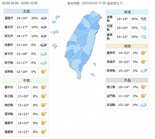 氣象局指出,預估今夜至明(9日)清晨,中部以北、東北部地區,低溫將降至12至13度,桃園至苗栗間的近山區及金門,則有局部11度左右低溫發生的機率,其他地區低溫約14至16度。