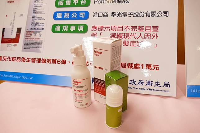 新北市衛生局食品藥物管理科長楊舒秦指出,另外像是彩妝、香氛類,還有美髮系列化粧品則有9件不合格,全數為標示不完整及涉及誇大。例如Pchome販售的「Dr.FORHAIR頭皮豐盈養髮液」,外包裝標示不完整,宣稱「減緩現代人因外在因素而掉髮症狀」涉及誇大,遭裁處1萬元。