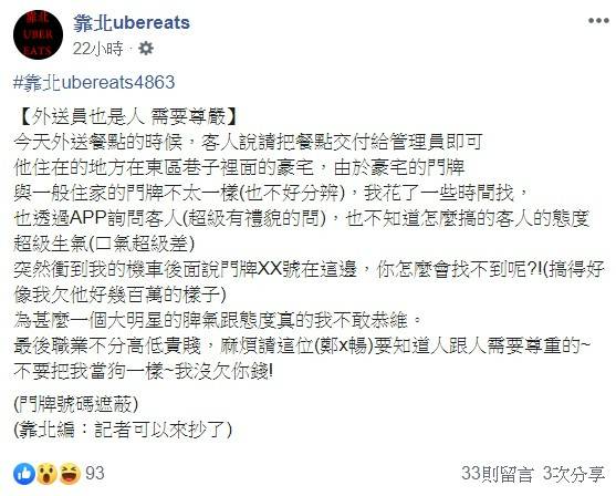 該名爆料的外送員在臉書「靠北ubereats」以「外送員也是人,需要尊嚴」為題發文,他指出當時在外送餐點的時候,客人說請把餐點交付給管理員即可,但客人住的地方在東區巷子裡面的豪宅,且豪宅的門牌與一般住家的門牌不太一樣,因此花了一些時間找,也透過APP詢問客人,沒想到客人卻突然衝到外送員的機車後面痛罵在這邊,你怎麼會找不到呢?