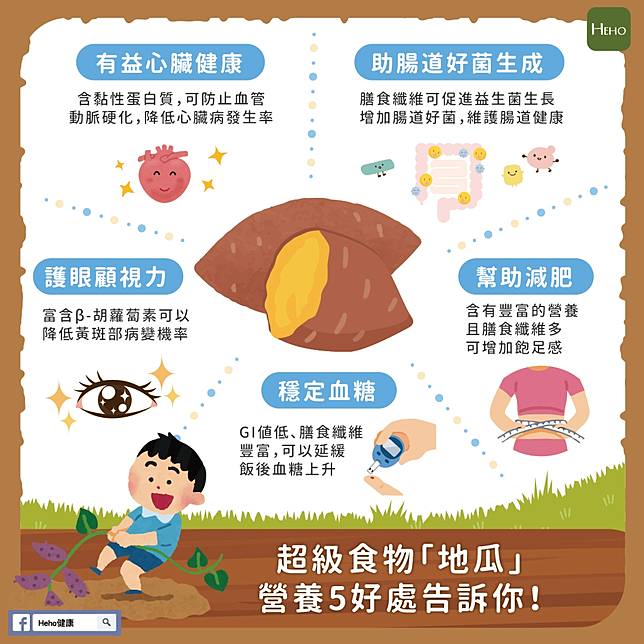 1. 有益心臟健康:地瓜含有的大量膳食纖維,可以降低膽固醇。而黏性蛋白質等多醣類物質,可防止血管動脈硬化 預防心臟病。