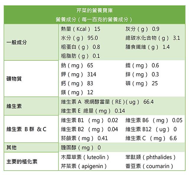 芹菜中的木犀草素、芹菜素及香豆素都是防癌高手,多吃芹菜可以增加防癌的戰鬥力。