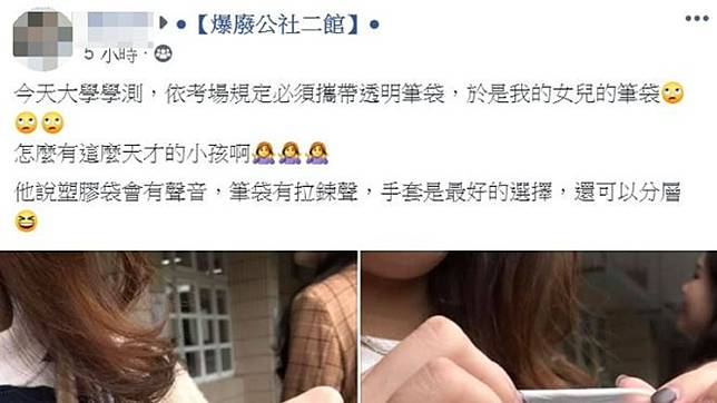 原PO在臉書社團「爆廢公社二館」貼出兩張照片,並寫下「今天大學學測,依考場規定要攜帶透明筆袋,於是我女兒的筆袋‧‧‧」只見原PO女兒手拿透明PVC無塵薄手套,裡面裝著身分證、兩支筆、橡皮擦等文具用品,還用每一格手指將物品區隔開,讓身為媽媽的她忍不住笑說「怎麼會有這麼天才的小孩啊!」
