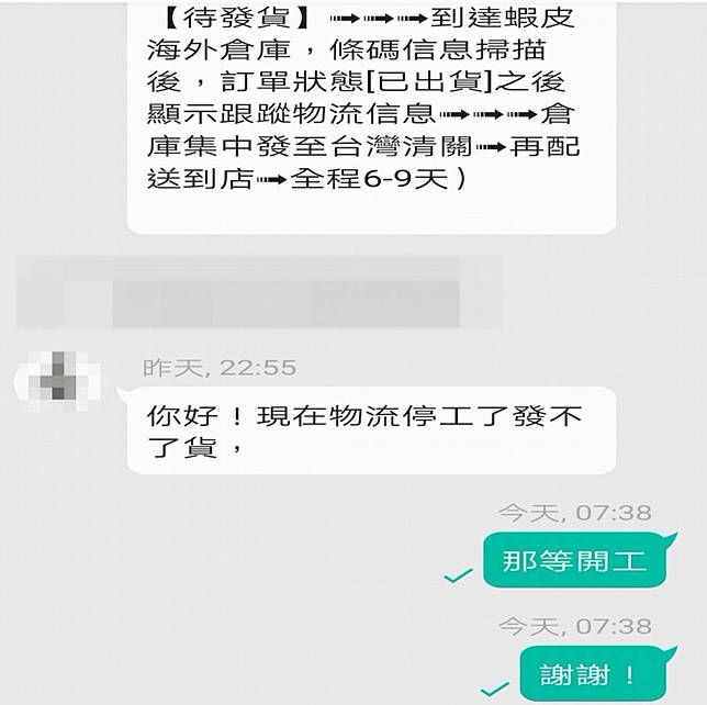 彰化市一名經常透過淘寶網購物的民眾指出,他在今年1月20日透過淘寶網購買3C產品、帽子共3件貨品,且已付款1900元,卻因為中國武漢肺炎疫情擴大,目前都無法寄出,經他上網詢問「何時可發貨到台灣」,對方竟回覆疫情防控期間,中國物流停工發不了貨,包括中國湖北、湖南、江西、福建等省分都停止發貨,「期間只接單不發貨」,客服每天不定期回覆,「勿催、勿催」。