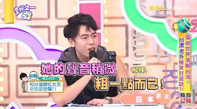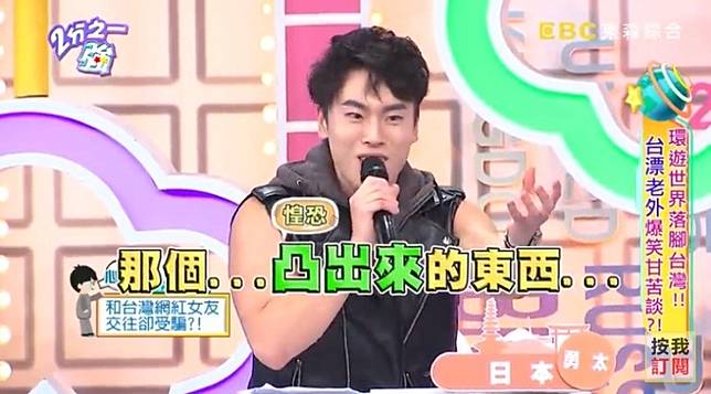 〔記者吳志偉/台北報導〕日本男模勇太(YUTA)是節目《2分之一強》班底之一,在台發展多年的他,最近在節目自曝,過去和一名台灣知名網紅交往,某次他帶女友和眾人聚會,好友們都露出不可置信的表情,才偷偷跟勇太說他的「女友」其實是個男孩,勇太剛開始還不相信,後來小倆口有了更進一步關係時,他看到對方「那邊凸出來」,才心酸承認事實。
