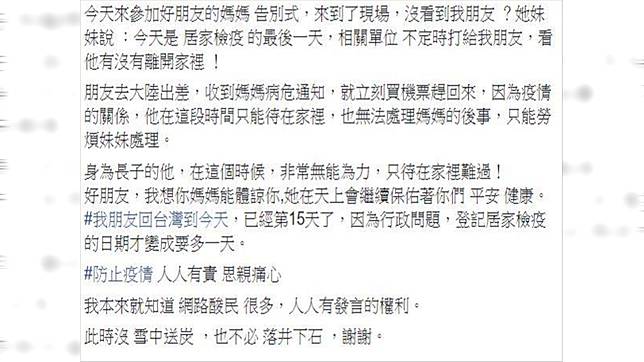 慘的是,因為行政問題,友人「登記居家檢疫的日期要多一天」,而這天偏偏又是媽媽的告別式,「身為長子的他,在這個時候非常無能為力,只能待在家裡難過。」讓原PO也感到揪心,透過PO文向好友喊話:「好朋友,我想你媽媽能體諒你,祂在天上會繼續保佑著你們平安、健康。」