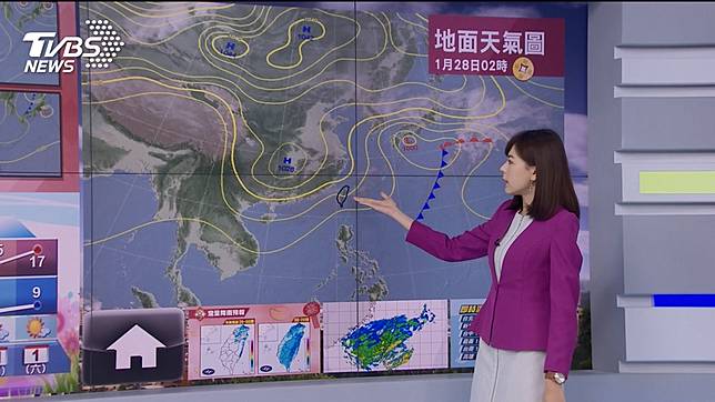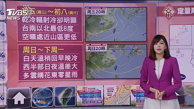 初五到初八轉乾冷,配合輻射冷卻效應,達到此波最冷的時期,尤其夜間清晨,臺南以北和東北部低溫下探8到11度,空曠地區或近山區平地,氣溫可能更低,務必注意保暖,要到周日白天才會稍微回溫,但早晚依舊偏冷。
