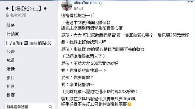 1名男網友在臉書社團「爆怨公社」發文,他在上班途中到了便利商店繳個費用,出來之後遇到2名學生在賣愛心筆,對方一看他就立刻上前詢問「大大,可以幫助我們學習,買一隻筆做愛心嗎?一隻只要250元就好!」當下男網友則回「我趕上班你找別人吧!」
