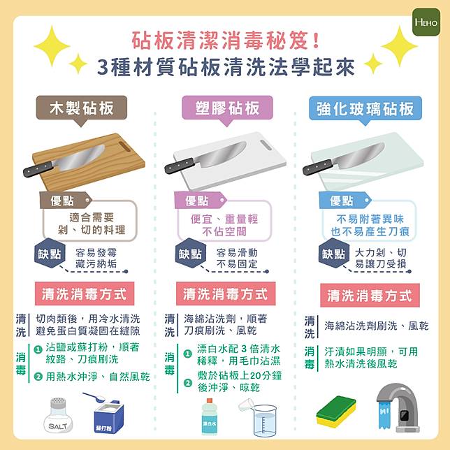 砧板是料理的必備用具之一,也是個料理者的好幫手。不過每次料理後你都有好好清潔它嗎?如果沒有清潔乾淨,可能會導致砧板比馬桶還要髒!那麼該怎麼清潔砧板呢?以下就來告訴你3種材質的砧板優、缺點,以及清潔消毒的方法,讓食物入口更安心喔!