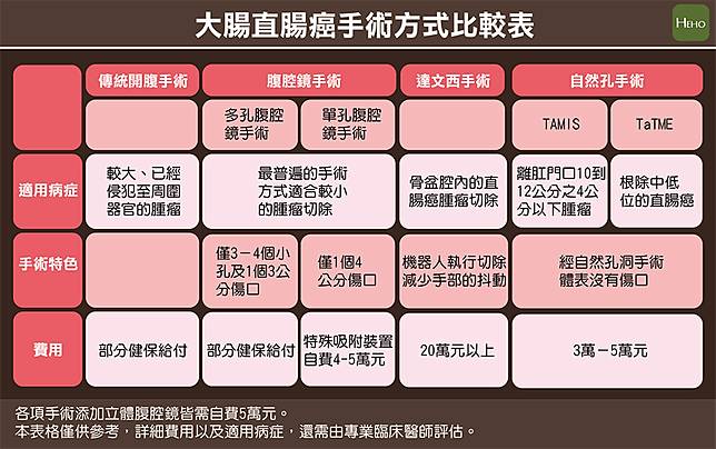 中山醫學大學附設醫院大腸直腸外科主任丁文謙表示,大腸癌有許多治療方式選擇,包括傳統手術、化學治療、放射治療,以及其他新穎的療法。現今手術越來越傾向微創、無創,不過最傳統的開腹手術目前仍然有在執行,「因為有些病人發現大腸癌的時候腫瘤已經太大,甚至已經侵犯到了其他的器官,手術比較複雜,這時候就會採用最傳統的開腹手術。」