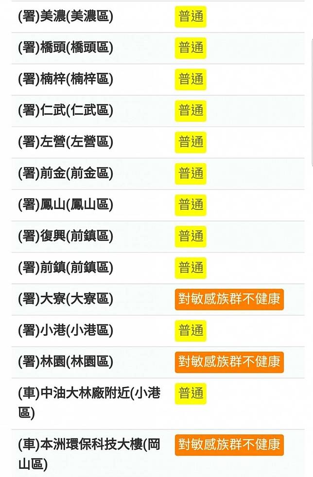 環保局表示,今早空氣品質不佳,14座測站中有3站,包括大寮、林園、岡山,AQI指標呈現橘色,對敏感族群不健康,並且將局部起霧情形。