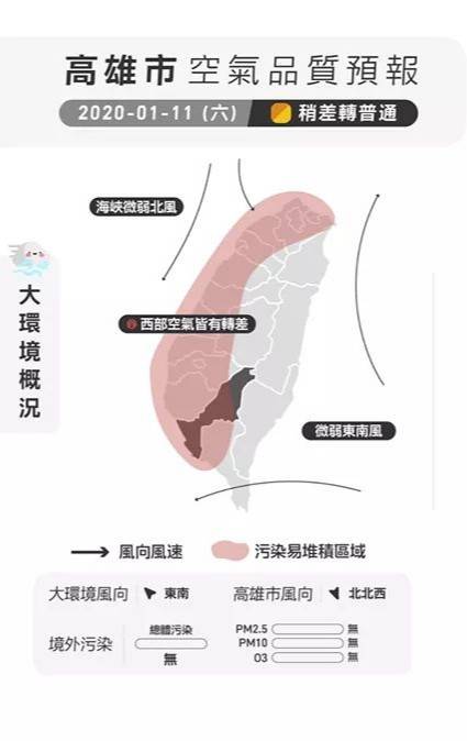 環保局指出,中午過後海風、北風同步增強,帶動地表風速增強,大氣水平擴散效率轉好,空氣污染將稍有緩解,逐漸往「普通」發展,請早起投票民眾,佩戴口罩出門,並且避免戶外劇烈運動,並注意能見度較差及行車安全。