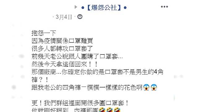 女網友4日在臉書社團「爆怨公社」上曬出數個格紋口罩套的照片,她表示前幾天老公說跟人團購了口罩套,到貨後一拿回家讓原PO傻眼直呼:「那個廠商…你確定你做的是口罩套不是男生的四角褲?!跟我老公的四角褲一模模一樣樣的花色啊!」事後又更新表示「我們群組裡面開很多團口罩套!他就剛好跟到…內褲那團。」
