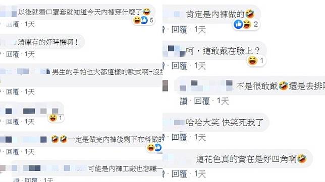 不少網友看完笑瘋,直呼「肯定是內褲做的」、「呵,這敢戴在臉上」、「這花色真的好四角啊」、「以後看口罩套就知道今天內褲穿什麼了」、「一定是做完內褲後剩下布料做的」、「剛好可以配整套啊」、「這樣穿搭才有整體性」。而原PO也在底下回應「不是很敢戴,還是去排隊買口罩好了。」
