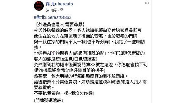 該名外送員在「靠北ubereats」臉書指出,以「外送員也是人 需要尊嚴」為題,直指「為什麼一個大明星的脾氣跟態度,真的我不敢恭維」。原PO表示,當時因為客人住在東區巷弄某豪宅,但門牌與一般住家不太一樣,不易分辨,因此比預定抵達時間稍微花了一點時間,但仍找不到。不過,透過app詢問該客人,卻換得對方超級生氣,口氣超差的回應。