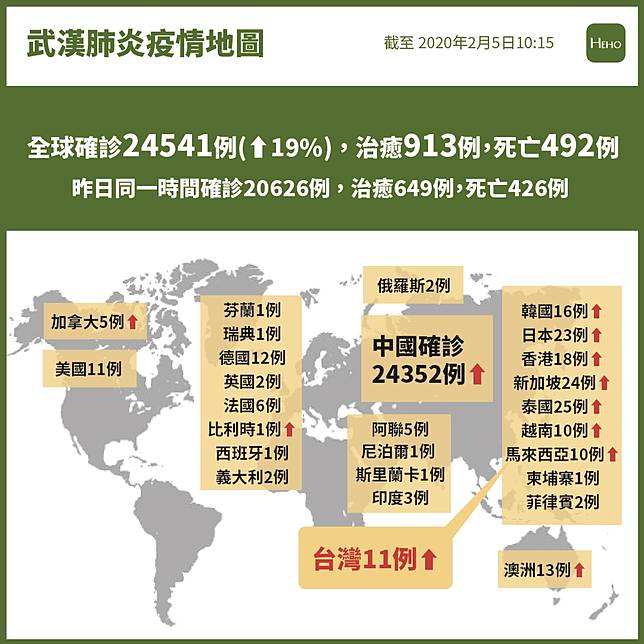 2019新型冠狀病毒(武漢肺炎)爆發至今,即便中國許多疫區已經封城了,感染人數持續上升。光中國湖北省最新通報,一天就新增湖北省新增3156案例。截至5日早上7點,全球26國共2萬4541人確診,死亡累計492人。我國昨日也新增1起確診個案,是從武漢包機返台的男性台商,總確診人數來到11人。