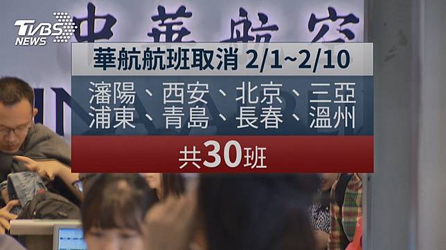 飛往大陸航班不少取消,像是華航,2月1日到2月10日,取消航班包括從桃園機場飛往,瀋陽、西安、北京、三亞、浦東、青島以及長春,還有松山飛溫州,總共加起來30班,武漢肺炎疫情,航空業、旅遊業都受影響。
