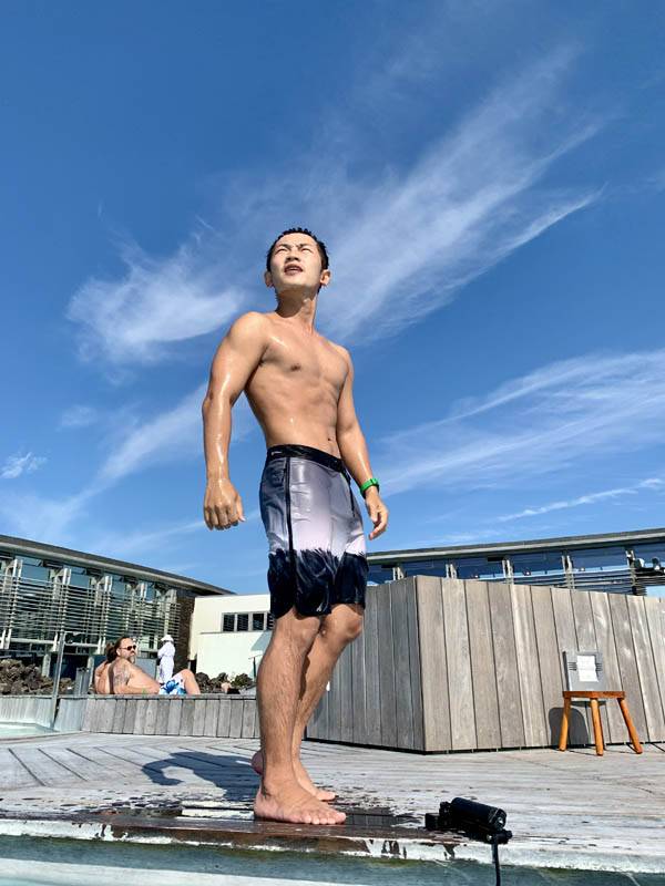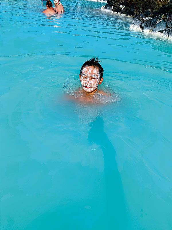 夫妻倆也造訪冰島著名的藍湖溫泉,藍色的湖水、飄渺的白霧,迷濛的夢幻景色,彷彿置身仙境,蔡昌憲跟風敷上當地特有的「Silica Mud Mask」矽泥面膜,一群臉塗白白的遊客同框泡溫泉,實在是個很奇妙的體驗。