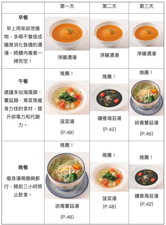 利用週末或休假日,輕鬆實行三日減脂計畫,只要在早、中、晚三餐集中火力單喝瘦身湯,就能將體內毒素及老廢物質一掃而空,讓你找回易瘦體質。