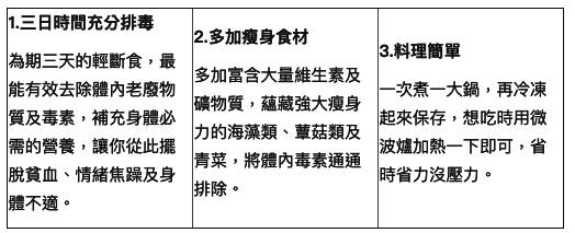 讓你擺脫水腫及便祕,使身體循環變好,親身感覺到身體暖呼呼的效果。利用休假日輕鬆實行,一點壓力也沒有。集中火力食用減脂效果顯著的瘦身湯,將囤積體內的毒素及老廢物質一掃而空,身體淨化之後,就能使身體歸零變成易瘦體質。三天後,相信你會驚訝地發現,身體變輕盈了,早晨醒來神清氣爽!(延伸閱讀:「生活很規律,卻得了乳癌」有些生活習慣,正在傷害你的身體)
