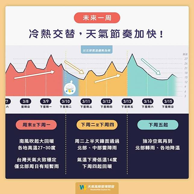 鋒面快速通過後,氣溫會明顯下滑,天氣風險 WeatherRisk表示北部地區低溫可能會降到在14度左右;周三(11日)後冷空氣減弱,周四(12日)將再度回暖。