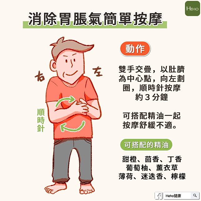 雙手交疊,以肚臍為中心點,向左劃圈順時針按摩約3分鐘,充分按壓腹部附近的穴位,也按摩到大腸腸道,使腸胃順暢。