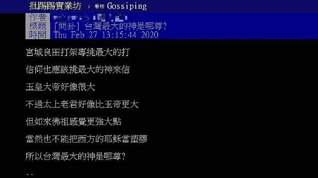 網友在PTT的八卦版發文詢問,標題為「台灣最大的神是哪尊?」內文提到,宮城良田(漫畫《灌籃高手》湘北高中的控球後衛)打架專挑最大的打,信仰也應該挑最大的神來信。玉皇大帝好像很大,不過太上老君好像比玉帝更大,但如來佛祖感覺更強大點,當然也不能把西方的耶穌當塑膠,「所以台灣最大的神是哪尊?」