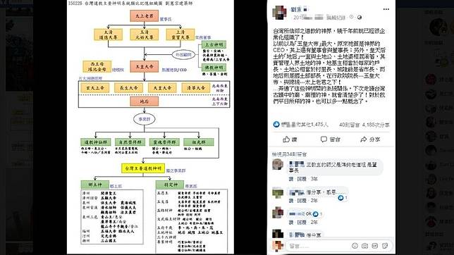 這個話題引發熱議,事後就有1名劉姓專家在臉書發文分析,還製作「樹狀圖」解釋,神明之間的關係為何。他提到「台灣所信仰之道教的神界,幾千年前就已經很企業化組織了!以前以為是『玉皇大帝』最大,原來祂算是神界的CEO,其上還有董事會與董事長。」
