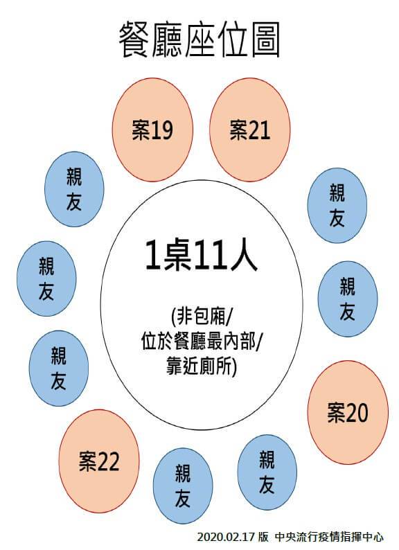 由於是在餐廳裡採非包廂方式聚餐,包括住在一起的2名家人,以及非同住家人10人,其中母親(案21)、弟弟(案20)同住一個屋簷下,研判是在家裡就感染到了。而外甥女婿(案22)之後也受到感染,其他親友則沒有。