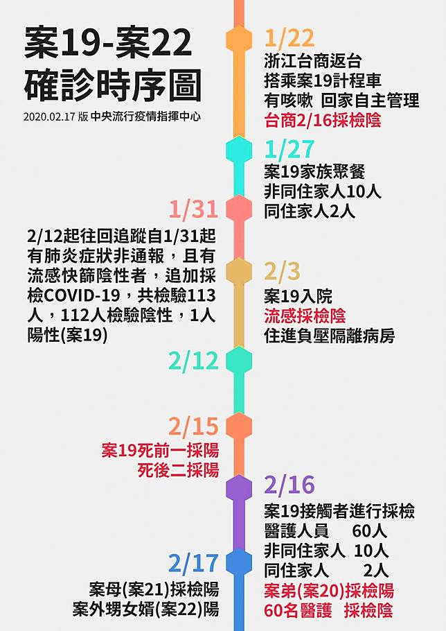 往回追蹤自1/31起,出現肺炎症狀卻不符合通報定義,且有流感快篩陰性的病例,最後找出113人,唯一被驗出武漢肺炎的就是案19。