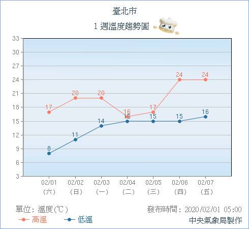 根據氣象局預報,周日、下周一寒流逐漸減弱,但受到輻射冷卻影響,氣溫仍低,白天氣溫逐漸回升,北部及東半部高溫約20至23度,其他地區約為24至26度,中南部則需留意日夜溫差大;天氣方面,各地大多為多雲到晴,僅有花東偶有局部短暫雨。