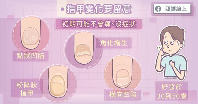 林聖堯醫師指出,乾癬性關節炎可能不會痛,醫師會從指甲有沒有變化開始診斷,初期指甲變化會有點類似灰指甲;再來指甲表面會有小小的坑洞,這是蠻特異性的表現。指甲坑洞有時需要比較強一點的光線,或者不同角度去觀察才會看的到。接著檢查指甲邊緣有沒有紅疹,若有的話,可能離指甲最近的關節按壓會疼痛。