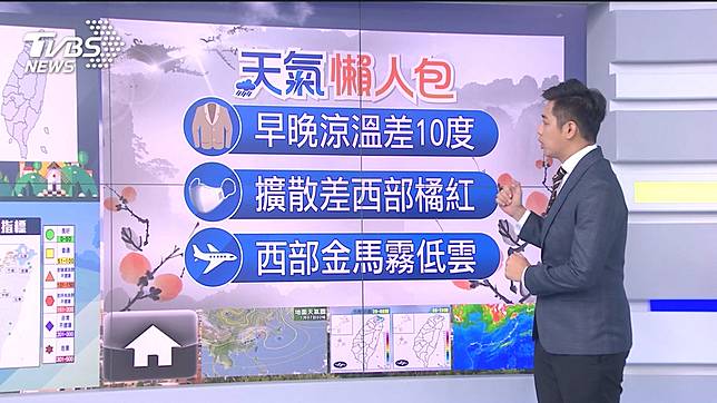 西部金馬地區,夜晚凌晨,容易有霧或低雲,影響能見度。不過擴散條件差,西部空氣品質依舊不好,外出請戴上口罩。