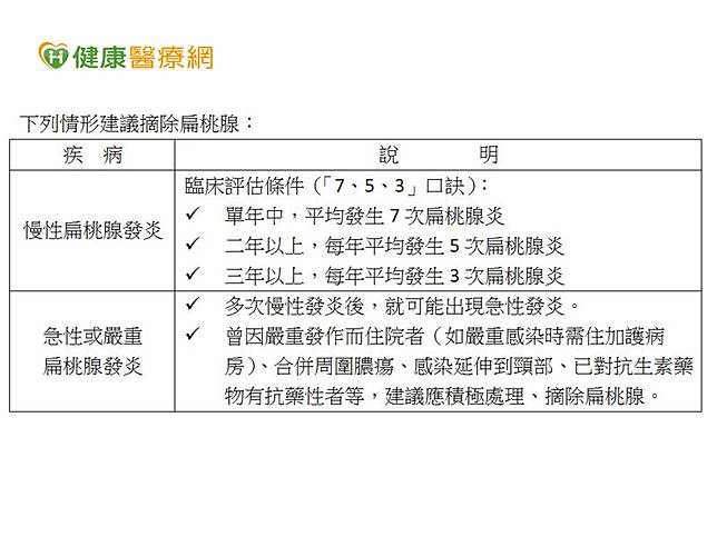高雄醫學大學附設醫院耳鼻喉頭頸外科主治醫師黃子晏說,扁桃腺具有免疫功能,但其實過了15歲以後,其在頸部所佔的免疫力就已經不足10%,因此對於有慢性發炎症狀或急性發炎的患者,通常會強烈建議將雙邊扁桃腺摘除(詳見下表),避免發生嚴重感染症的風險。