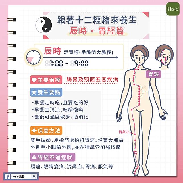 辰時 ( 早上7 – 9點 ):走胃經 ( 足陽明胃經 ) 主要治療、調理腸胃道及頭面五官疾病。