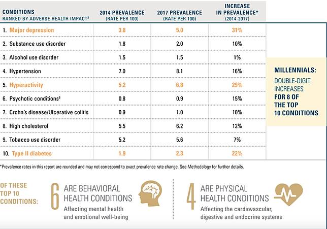 根據美國藍十字藍盾協會(BCBSA)的研究調查,發現在現在的世代中,「行為健康狀況」對我們生活的影響,要遠遠大於身體健康,而其中影響最大的,是「重度憂鬱症」跟「注意力不足過動症」。