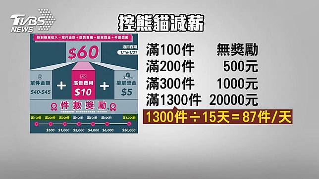 和舊制相比,舊制是依照單數,分為每單70元、80元或是110元,新制則是統一每單60元,但有件數獎勵。