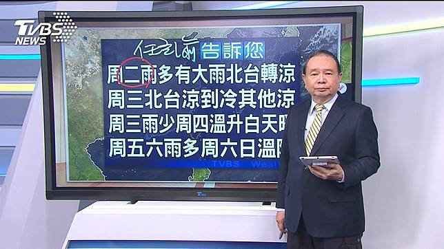 周二各地雨,北台局部大雨,溫降轉涼,周三北台涼到冷,其他地區舒適,周三四東台零星雨,周四溫升白天暖,周五六各地雨,周六日溫降,轉涼到冷,詳細天氣概況。