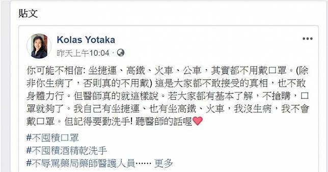 武漢肺炎引發口罩之亂,就算政府祭出實名制購買,許多民眾還是大嘆一罩難求。政府為此特地呼籲不是每個人都需要戴口罩,行政院發言人Kolas Yotaka也表示「坐捷運、高鐵、火車、公車,其實都不用戴口罩。」但振興醫院感染科主任李明政卻公開打臉,強調:「到公共場所、封閉空間、公共的交通工具是一定要戴(口罩)。」