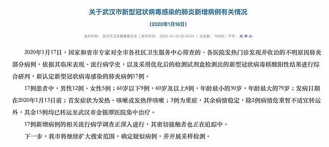 通報內指出,17例患者中,男性12例、女性5例。60歲以下9例,60歲及以上8例,年齡最小的30歲,年齡最大的79歲,發病日期在2020年1月13日前,首發症狀為發熱、咳嗽或發熱伴咳嗽,3例為重症,其餘病情穩定,除2例病情危重暫不適宜轉運外,其餘15例均已轉至武漢市金銀潭醫院集中治療。
