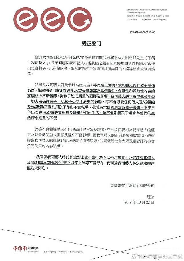 謝霆鋒的經紀人霍汶希昨(21日)表示這件是純屬傳聞、是炒作,所以不予回應;不過謝霆鋒所屬英皇公司今(22日)發出嚴正聲明,表示近來外界有對於謝霆鋒的不實謠言,特此聲明謝霆鋒與孩子的關係良好、相處融洽,並表示傳聞已對孩子造成嚴重的困擾及影響,謝霆鋒嚴正重申他會用盡一切方法保護孩子,免孩子受到不必要的影響,也不會忍受任何人利用孩子做不實報導,否則將循法律途徑追究責任。