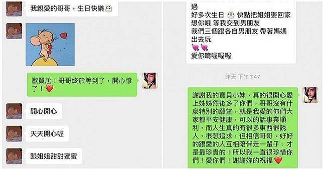 而22日張書豪過31歲生日,但仍不忘放閃,PO出「妹妹」的生日祝賀。妹妹寫道,「開心開心、天天開心喔,跟姐姐甜甜蜜蜜,希望還可以跟你一起過好多次生日,快點把姐姐娶回家,想你哦,等我交到男朋友,我們3個跟各自男朋友帶著媽媽出去玩。」