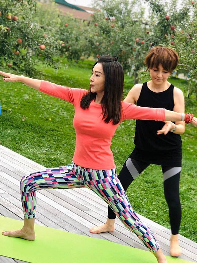 陳美鳳赴日體驗蘋果樹下做瑜珈,美好曲線完全遮不住。(圖/民視提供)
