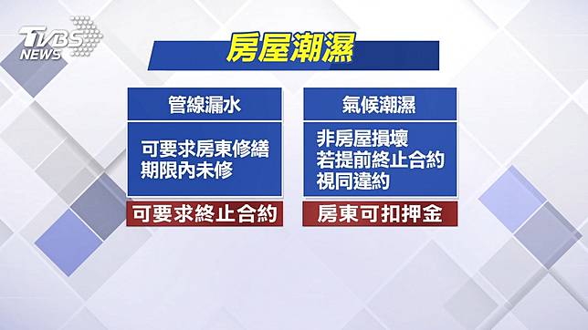 房屋潮濕分兩種狀況,如果是管線漏水導致,房客可要求房東修繕,如果房東在期限內沒修好,房客可以要求終止合約,但如果是本身氣候潮濕,非屋況損害,房客責無權終止合約,若提前退租視同違約,房東可按照雙方約定扣除押金。