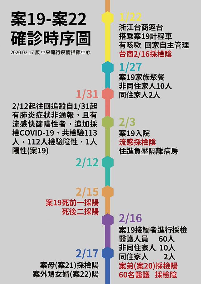 新增加確診個案,為中部 80多歲女性(案21)及30多歲男性(案22),同時也是昨日公布案19(死亡個案)及案20之親人。衛生單位於昨日進行接觸者調查時發現,案21曾於2月6日出現症狀就醫,案22則於1月28日至2月6日間出現發燒、咳嗽等症狀,兩人經採檢均於今日確診。由於案22與其他3位平時並未同住,研判是過年期間家族聚會時遭到指標個案傳染,為一起「家庭群聚」。