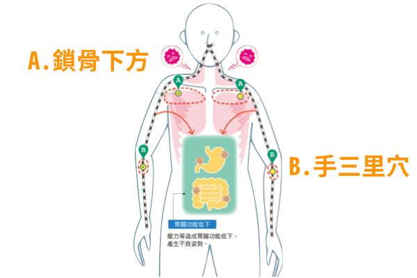 精神壓力造成胃腸功能低下的話,身體就容易往前屈,肩膀周邊的肌肉也會緊繃起來。刺激「手三里」穴,藉「大腸經」這個與胃腸功能相關的經絡來改善胃腸功能低下的症狀,久而久之,就能矯正姿勢,紓解肌肉的緊繃。