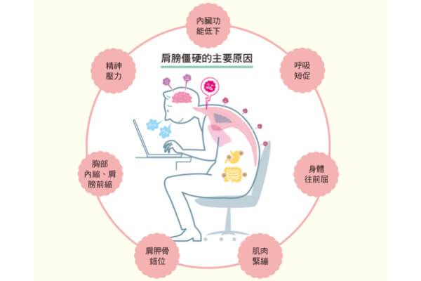 肩膀僵硬的原因非常多。姿勢問題、精神壓力、胃腸功能低下等,而且無法斷言是單一原因造成的,通常,這些問題會互相影響,導致肩膀周邊出現緊繃症狀。