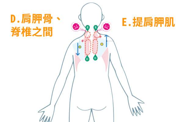 肩胛骨與脊椎之間的肌肉過度緊繃,也是造成肩胛骨左右失衡、肩膀僵硬的原因。由於呼吸也會變得短促,導致肩膀周邊肌肉的緊繃。按摩這個區域可以矯正肩胛骨的位置,同時具有放鬆的效果。