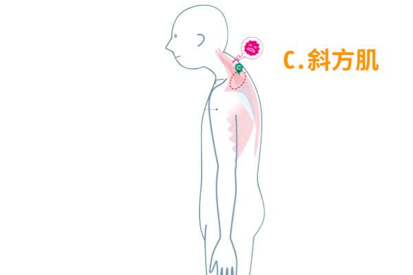 長時間坐在辦公桌前工作會養成身體往前屈的毛病,於是,從後頸到肩膀便會累積頭部重量的負擔。請直接放鬆因支撐頭部而緊繃、僵硬的斜方肌。