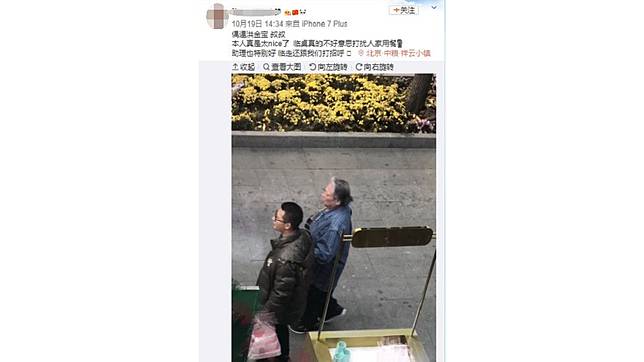 近日,則有一名大陸網友在微博透露,用餐時巧遇洪金寶本尊,並拍下助理攙扶他的畫面,原PO稱讚洪金寶,「本人真是太nice了。」但不好意思打擾他用餐,僅拍了對方用餐完離開身影並大讚,「助理也特別好,臨走還跟我們打招呼。」