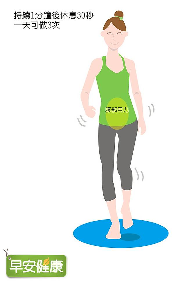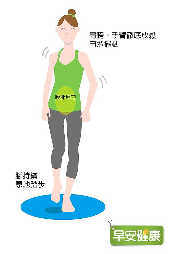 首先完全放鬆肩膀跟手臂的力氣,只要腹部用力,接著只要在原地踏步就好。此時整個人的手臂和上身會自然擺動,外表看起來就像是殭屍一樣。